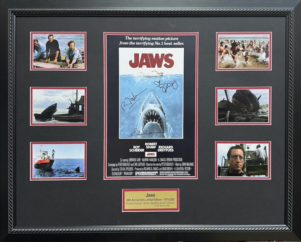 Dive into this rare opportunity to own an item from this iconic cinematic thriller! – This unique 50th anniversary item comes beautifully custom framed with double-layered, black and red matting, and braided-design black wood frame, with black-on-gold engraved nameplate. UNIQUE TO THIS PIECE! SIX (6) full-color 3x5 film stills depicting iconic scenes from the 1975 classic! Signed by: Richard Dreyfuss (Actor), Steven Spielberg (Director) & John Williams (Composer). This limited edition is numbered, with only 50 in existence.