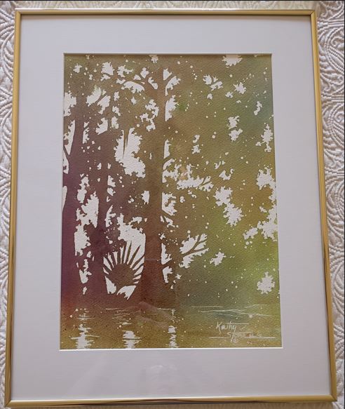 This is "demo#4" of Kathy Miller Stone's poured transparent watercolor of a cypress swamp in rust, green & gold - an original design.  Stone has garnered many awards in International, National, and Local Exhibitions and serves on the Louisiana Watercolor Society Board of Directors.  This lovely framed piece is 16" x 19".