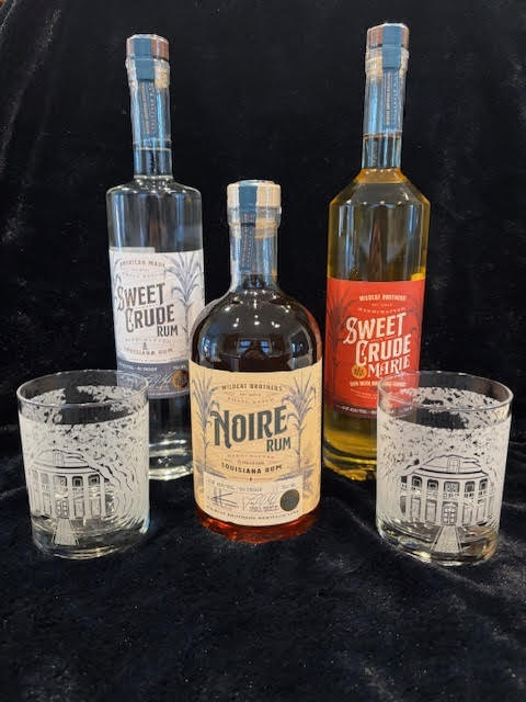 Enjoy three bottles of Wildcat Brothers's award-winning rum from the distillery's Heritage Line in your beautiful new Oak Alley glasses by Mignon Faget.