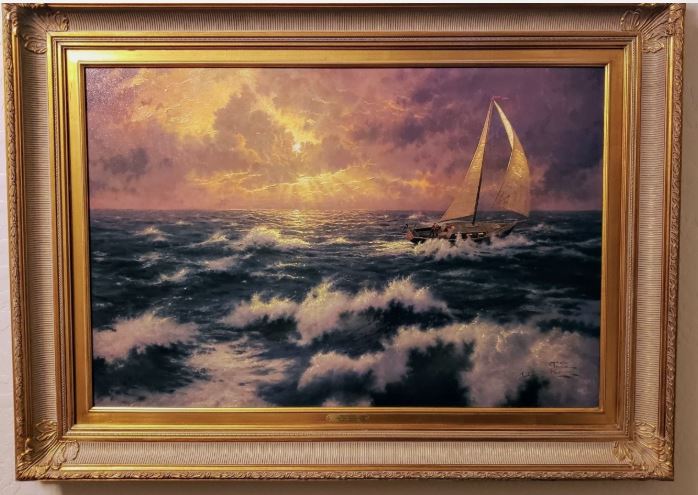 Rough seas toss a fragile boat in this dramatic image, but we can see the sun beginning to break thru the clouds with the promise of calmer waters.  The sailor's faith and perseverance will soon be rewarded in this canvas by the same name.  This striking 24" X 36" numbered edition comes with certification.