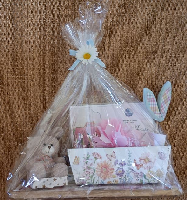 Nothing Bundt Cakes has provided a spring gift basket including spring decorated board and matching box with floral decorated drinking glass or candle holder, soft rabbit and a bunny ears decoration for your cake. This also includes a gift certificate for a 10" decorated cake.